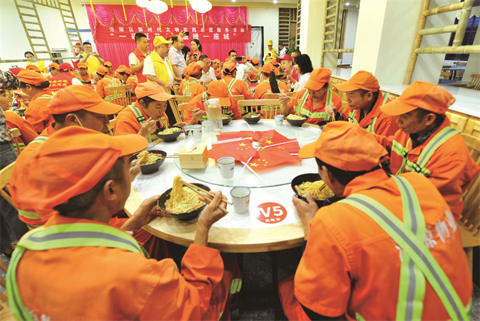 环卫工人欢聚一堂同吃国庆寿面