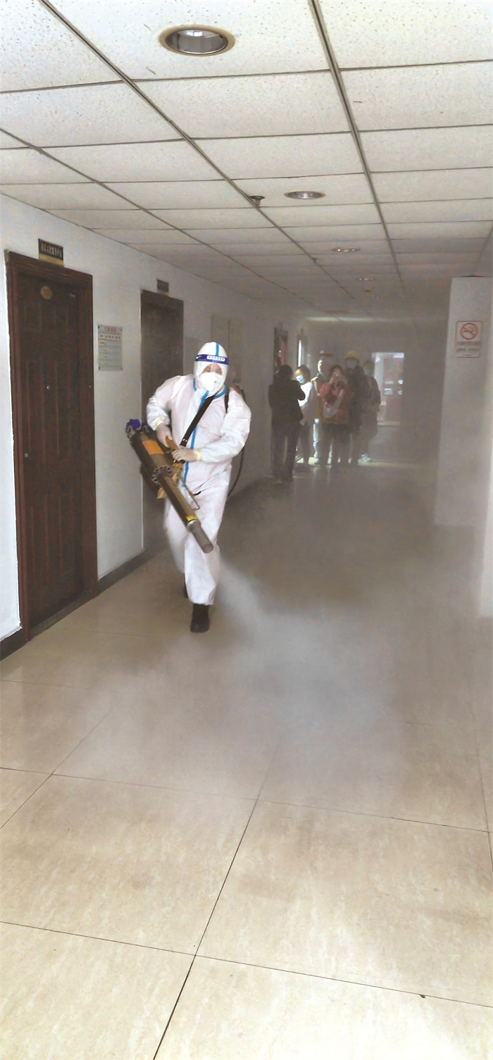 张军在发出请战书的同时,就已经组建好了消杀志愿服务队伍,窦伟、冉松、夏箔等队员第一时间报名,并迅速集结出发,18人于当天下午4点赶到封控区域,两人一组负责9个单元所有区域的消杀工作。18名队员穿戴好专业防护服、头套、脚套、手套和面罩,背上消杀设备,就像战士扛上钢枪,坚定地走进“战场”。张军冲在了第一个。