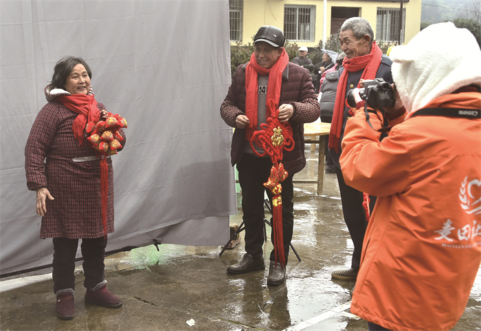 在马武镇碑记村送温暖活动中,志愿者为老人拍照记录幸福瞬间。