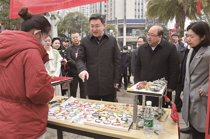 活动现场,舞龙舞狮、文艺歌舞、汉服秀精彩纷呈,非遗、国风、年货、文创等展销展示应有尽有。王志杰走进民俗文化展销集市仔细察看,与参展客商详细交谈,询问产品展销和交易情况,祝大家生意兴隆,并希望大家当好涪陵的宣传员,带动更多“朋友圈”客商来涪发展。他鼓励商户们要把涪州糖画、笋壳画、菜乡结绳等非遗保护好传承好,将非遗保护传承和巩固拓展脱贫攻坚成果、乡村振兴、文旅产业发展等有机结合,让非遗活起来,以非遗产业带动群众增收致富。要充分挖掘白鹤梁水下博物馆、816工程、武陵山大裂谷、美心红酒小镇等文旅资源,结合消费者需求,讲好讲深涪陵故事,积极开发更多特色文创产品。要传承和创新中华老字号品牌,做好涪陵榨菜、油醪糟、胭脂萝卜等特产文章,不断丰富产品品类和功能。有关部门要深入落实“实施高品质生活惠民富民行动”,聚焦惠民有感,办好办活各类活动,大力发展“假日经济”“夜经济”“江岸经济”等特色经济,全面促进消费提质扩容,不断提高人民群众的获得感、幸福感、安全感和认同感。