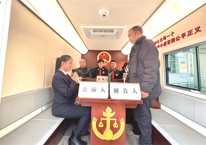 3月9日,车载便民法庭开进涪陵区同乐镇同建社区院坝,现场审理非法移栽南方红豆杉案件。涪陵区人民法院审判员李信梅、袁兴海、人民陪审员胡渝三人组成合议庭,李信梅担任审判长。