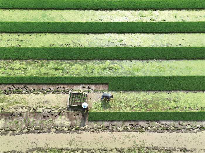 村民正在秧田取秧苗
