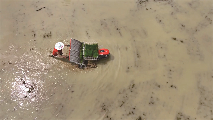 村民使用插秧机插秧
