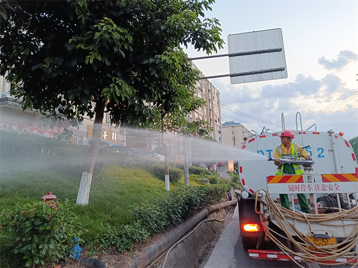 8月18日9时许,在涪陵城迎宾大道看到,一辆洒水车正开启警示灯缓缓地行驶在路边,满头大汗的园林绿化工人黄平站在洒水车后的操作平台上,双手紧握水枪,为绿化带上的植被浇水。“夏季给植物浇水的最佳时间是上午或傍晚。下午的土壤温度过高,会影响植物正常吸收水分,反而会给植物造成伤害。”黄平一边说,一边拿着水枪移动位置。此时的他已经工作了3个多小时。