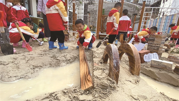 走进涪陵区幼儿园昕晖园,小朋友们正在沙土区搭桥、通渠、灌水。他们互相配合、分工合作,用双手建造属于他们心中的两江四岸。王姝妤小朋友指着自己的作品骄傲地介绍:“江的两边有图书馆、爻里小镇、白鹤梁水下博物馆,尖尖那里就是两江交汇的地方。”在开心游戏中,孩子们加深了涪陵地理位置、两江文化的认识。涪陵区幼儿园昕晖园教学负责人杨丽萍介绍:“沙土游戏采取小朋友全自主的方式进行,过程中老师不做过多的干预,他们自行选择游戏材料、游戏伙伴、划定游戏场地,进行游戏。通过不断的探索实践,一方面了解涪陵的本土文化,另一方面也提升交际能力。”
