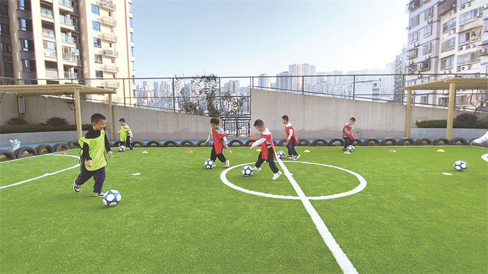 “团队的力量比单打独斗大得多,效率要高得多。比赛中一定要互相配合,大家准备好了吗?”随着一声哨响,涪陵区二幼江山园的楼顶运动场瞬间热闹了起来,孩子们个个脚下“生风”,运球、过人、射门,不断向对方球门发起进攻,每一次进球都引得大家欢呼庆祝。涪陵区第二幼儿园江山园副园长蔺键介绍:“我们整个足球项目的练习都是以游戏为载体进行,包括射门、运球、踩球等,以此培养孩子们对足球运动的兴趣,让孩子们在体育锻炼中享受乐趣、健全人格、锤炼意志。”