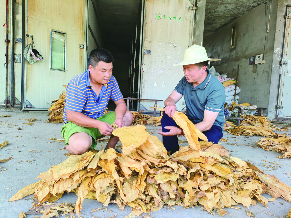 张灵松(右)给村民讲解如何挑选烟叶