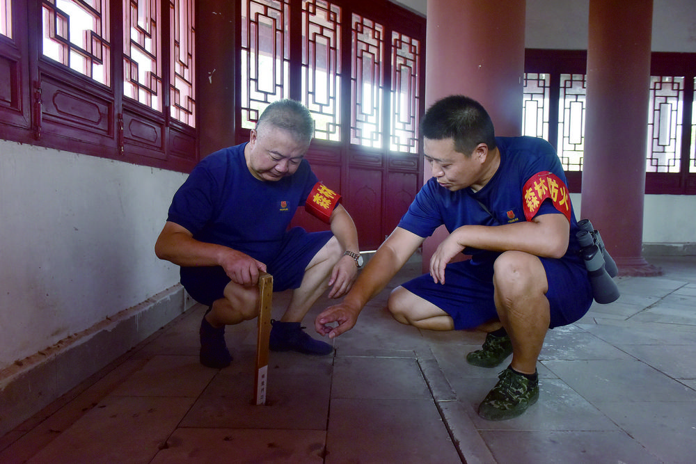 8月18日一大早,太极森林公园十余名护林员带着剪刀、电动灭火器等工具上山,对消防隔离带进行清理。电动灭火器重约30斤,背一会儿就汗流浃背。经过三个多小时的努力,近4公里隔离带清理完毕。随后,护林员检查了防火水塔蓄水池水位。此外,消防员还要爬到公园最高处的望州阁塔顶,使用望远镜巡查这片森林。