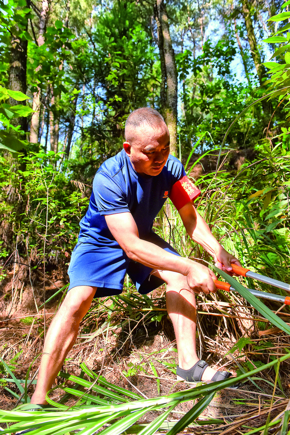 护林员清理隔离带的杂草