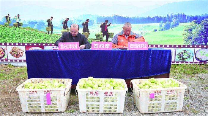 11月8日,重庆早市鲜食青菜头示范会暨品鉴推介会在涪陵区大木乡宣王村举行,来自市内外的种植大户、销售企业负责人聚集在一起,共同见证“早熟丰产”的“渝早100”青菜头迎来今年首次大规模上市,并现场进行产销签约。