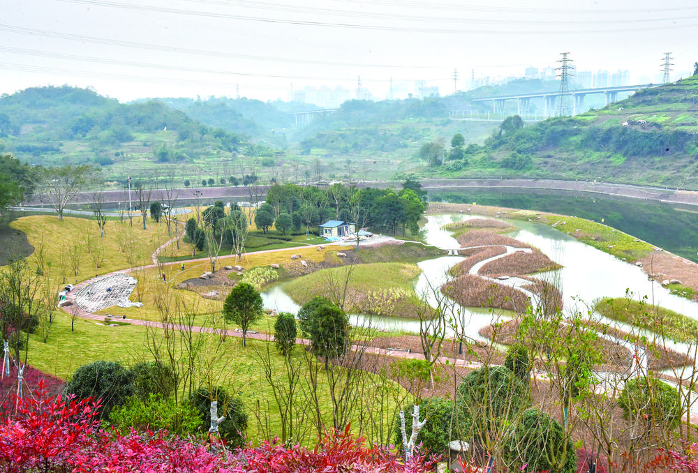 园林道路纵横交错,景观绿化错落有致,荷塘湿地依山傍水,廊桥栈道清幽古朴,与清澈如镜的涞滩河相互映衬,勾勒出一幅“河畅、水清、岸绿、景美”的生态美丽画卷。目前,涪陵高新区涞滩河水环境生态修复工程完工,市民新增一处生态休闲打卡地。
