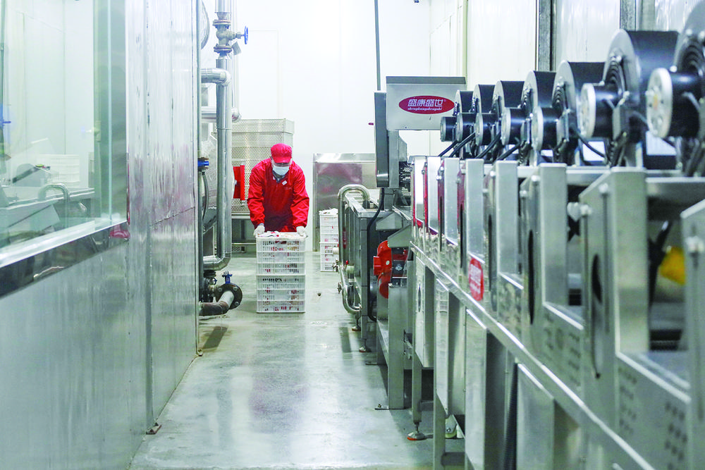 在该公司休闲食品全自动包装生产线上,全自动包装机运转不停,工人将泡椒凤爪原料倒入投料口之后,机器自动完成称重、包装、塑封等工序。在杀菌车间,一袋袋休闲食品经过全自动化设备杀菌、烘干后,最终打包装箱进入产品库。