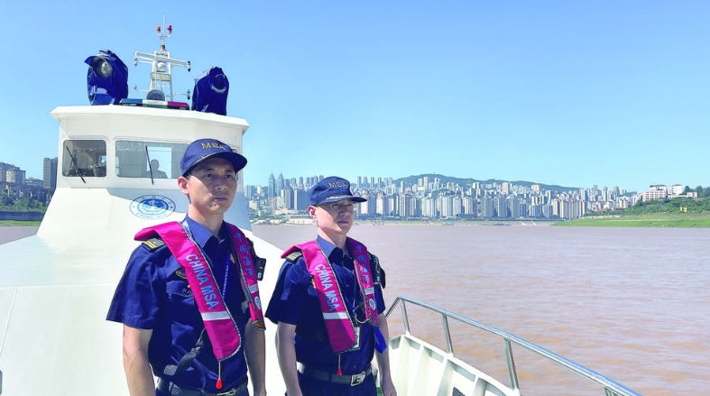 涪陵白鹤梁海事执法大队的执法人员沿江巡逻,发布临时管制信息,提醒船舶注意通航安全