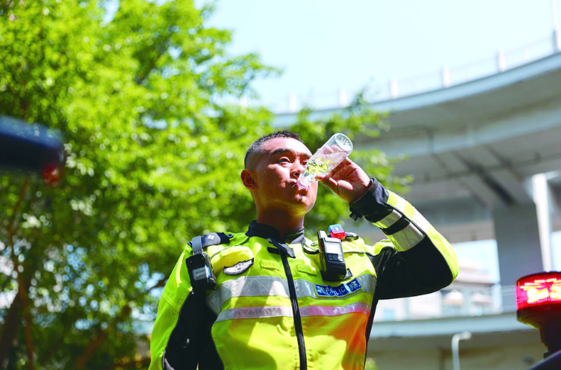 烈日下的公路热浪滚滚,站在马路上不到5分钟汗水就浸湿衣裤、模糊视线。执勤民警辅警的感受就是热,烫手、烫背。他们穿梭在车水马龙之中,对重点路段开展巡逻、疏导路面拥堵、事故处置等工作。他们的衣服是湿了又干,干了又湿,脸庞也是黑里透红,“健康的荞麦肤色”成了他们一致的高颜值。