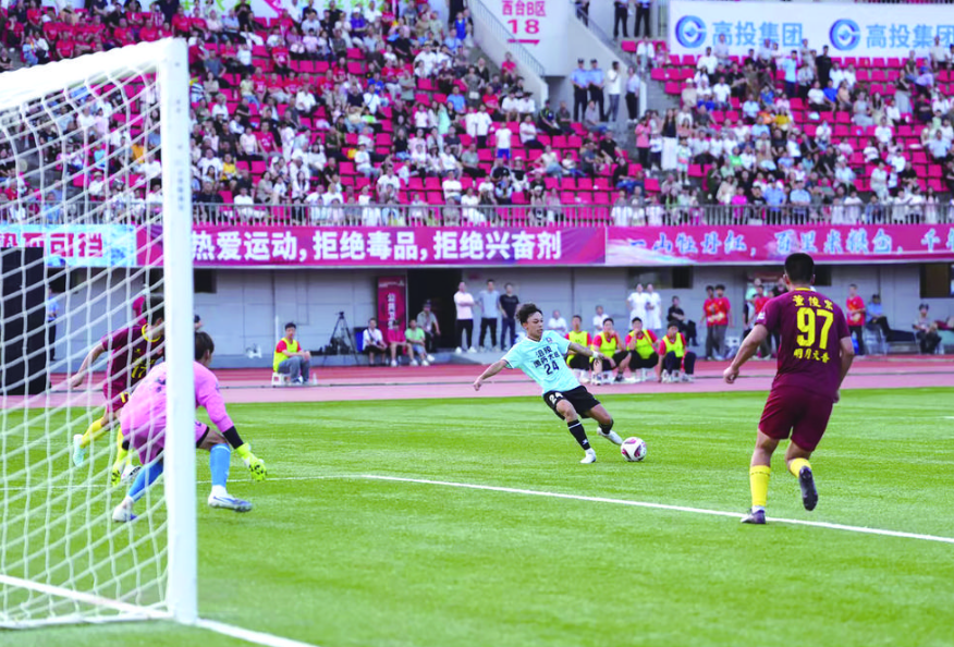 比赛进行到第39分45秒,迎来决定本场比赛输赢的关键进球。涪陵队24号前锋张杨在对方禁区外接到队友直塞球,突然起脚远射,足球如炮弹般直冲对方球门,垫江队门将扑救不及,比分改写为1:0。