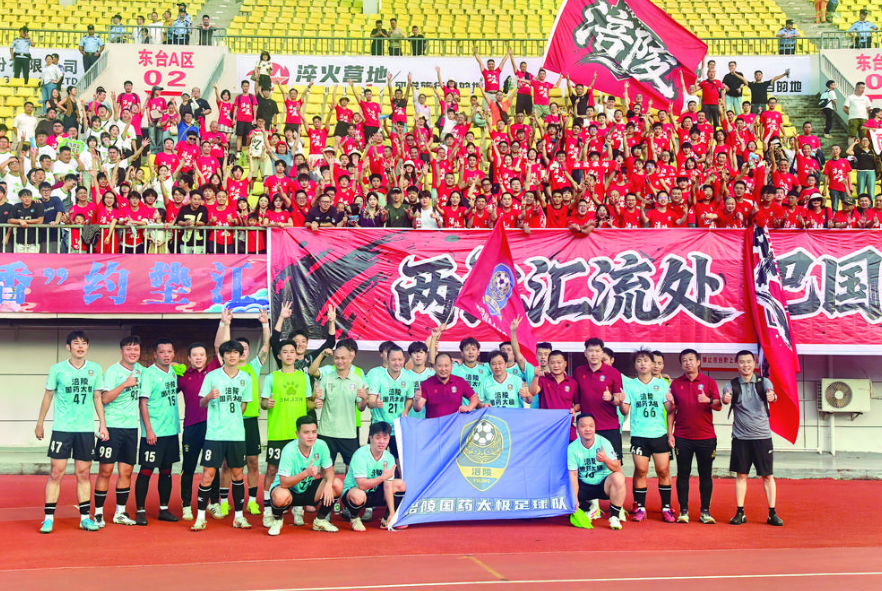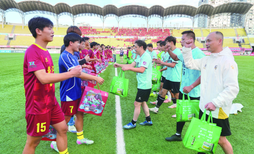 终场哨声落下,赛场上的竞技对抗瞬间转化为场下的温情互动。两队球员列队走向中场,握手致意后互换特色礼品:垫江明月天香队精心准备了小麻花、牡丹酥等当地传统点心,搭配承载童年记忆的天府可乐,尽显东道主热情;涪陵国药太极队以藿香小可乐、丹参口服液作为回礼,将地域医药文化融入友谊传递,双方球员笑着拥抱,定格“场上对手、场下朋友”的温馨瞬间。