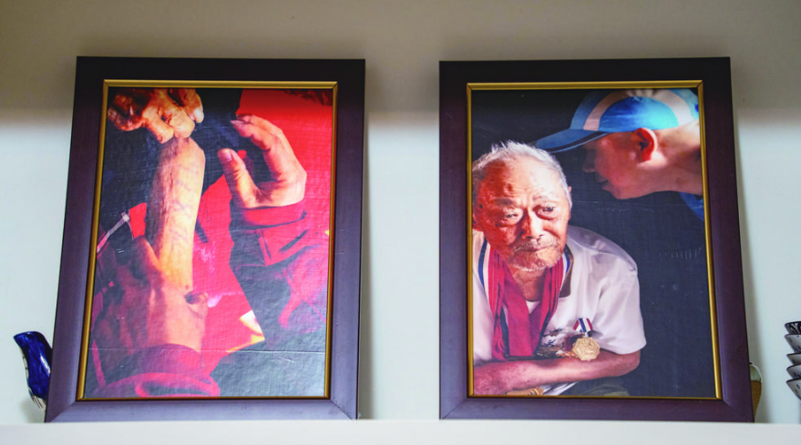 谭培文说:“除了刺青,老爷子身上还有17处刺刀伤疤。每一位抗战老兵,都是一部‘活着的历史’。”他和这些抗战老兵的故事起于2010年的一个夏天。谭培文在山间徒步,突降的暴雨让他无意中躲进抗战老兵黎兴甫的家。推开门时的景象让谭培文至今难以忘怀:“屋子里摆满了接雨的盆钵,甚至床上也摆了两个。”