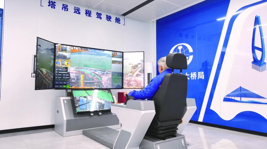 “传统塔吊司机需要在数十米高空狭小驾驶室作业,面临坠落、眩晕等风险,而且视野受限易产生盲区,如今司机在塔吊远程驾驶舱操作,通过5G低延时精准控制,配合全景摄像头与MR技术消除盲区,AI智能识别与激光雷达主动避障,大幅降低人员高处坠落及碰撞事故风险。”中铁大桥局宜涪高铁重庆段站前6标综合办主任侯志强说,“单台驾驶舱可同时控制4台塔吊,减少司机上下塔吊的频繁移动时间,吊装作业连贯性更强,减少设备等待时间,整体施工效率显著提升,真正实现‘天操’变‘地操’,安全更牢、效率翻倍。”