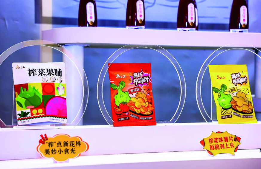 在创新产品方面,推出乌江榨菜脆片、胭脂萝卜果汁及榨菜果脯。其中,榨菜脆片实现零脂肪、自带咸鲜风味;胭脂萝卜果汁含活性益生菌;榨菜果脯结合古法与现代工艺,成为“地方特色休闲食品”新名片。