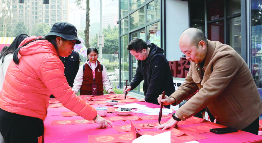 活动现场,“马上来——新春文化系列展览”、《文化记忆谱芳华》涪陵区图书馆馆藏家谱展、《涪州传拓制作技艺》体验、书法家现场书写春联并赠送、涪陵非遗主题展览等多项新春传统文化体验活动轮番登场,受到市民热捧。