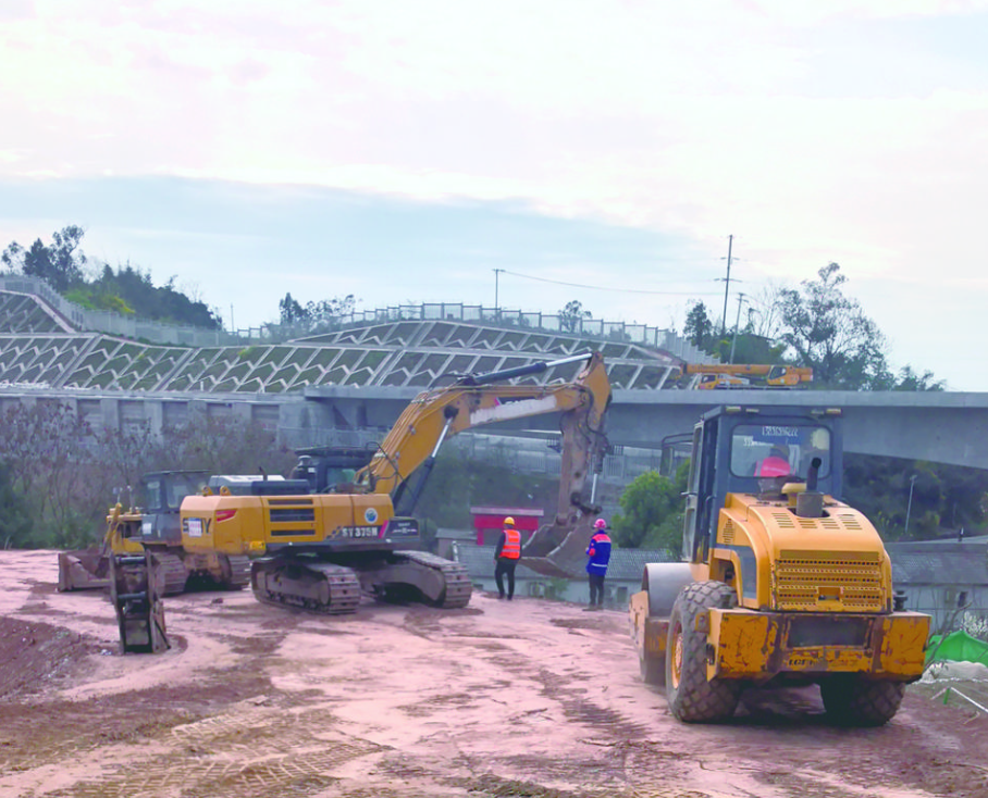 当天上午,在G5021石渝高速涪陵北环段明家湾枢纽复工现场,机械轰鸣声不断,挖掘机正在开展路基整形修坡作业,压路机也在进行路基压实作业,呈现出热火朝天的建设景象。