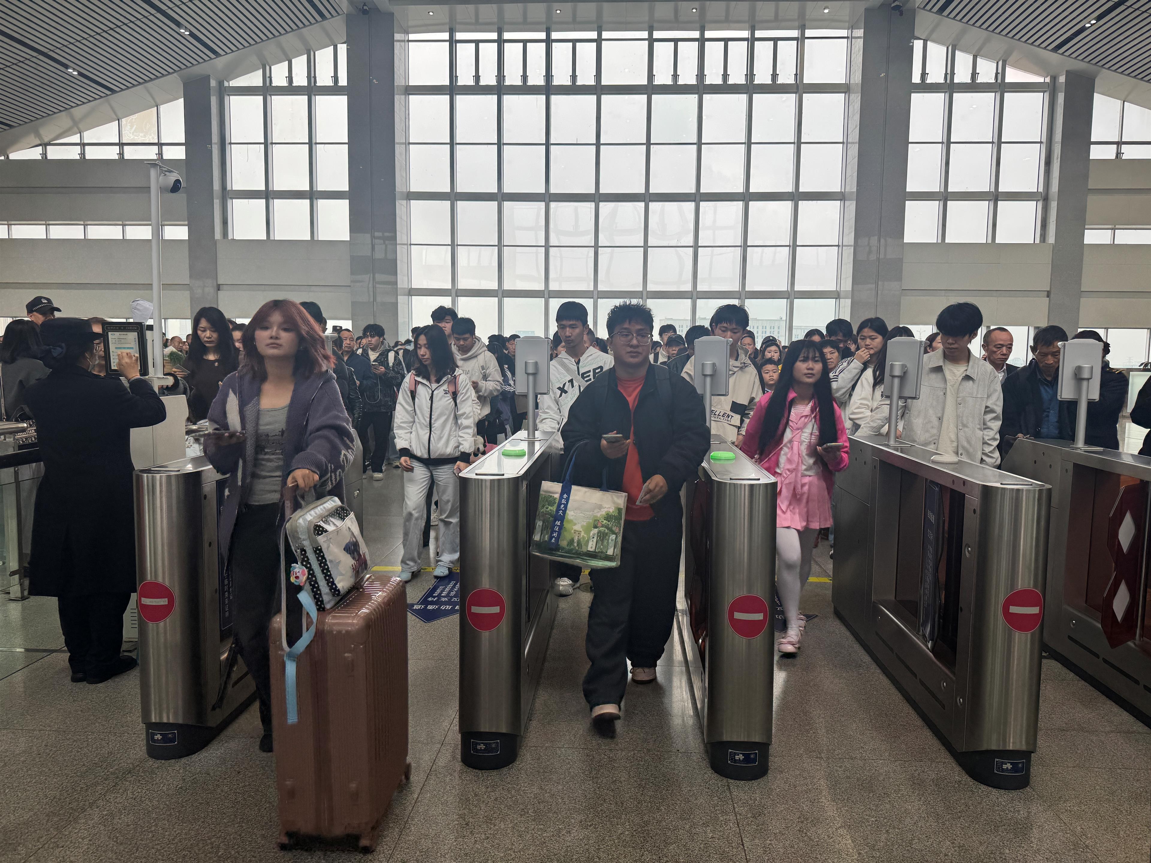 旅客在涪陵北火车站有序候车通过验票闸机进站台乘车