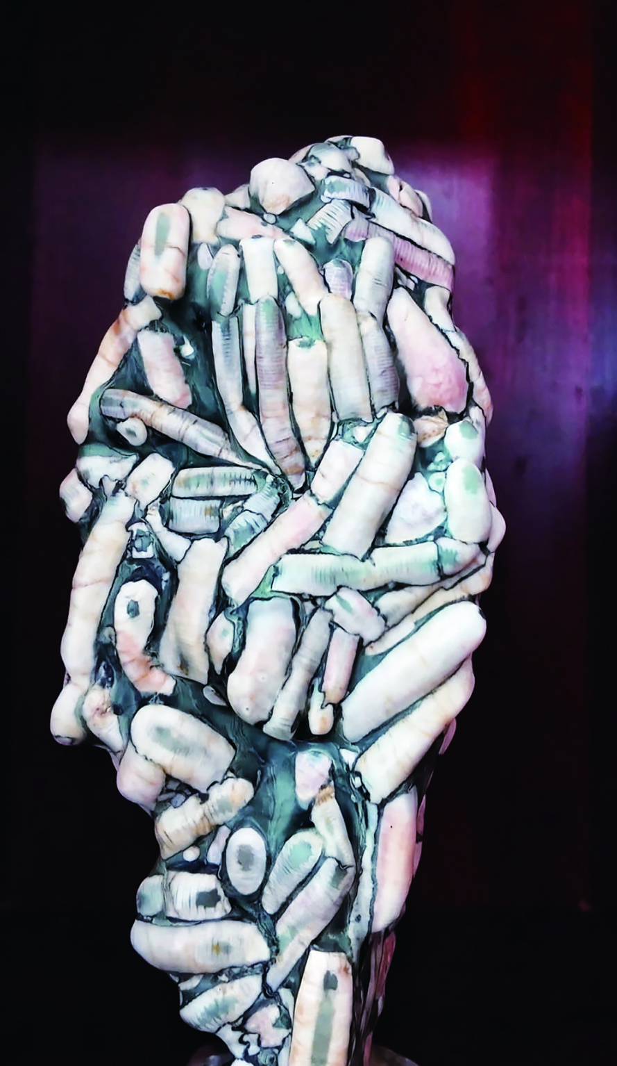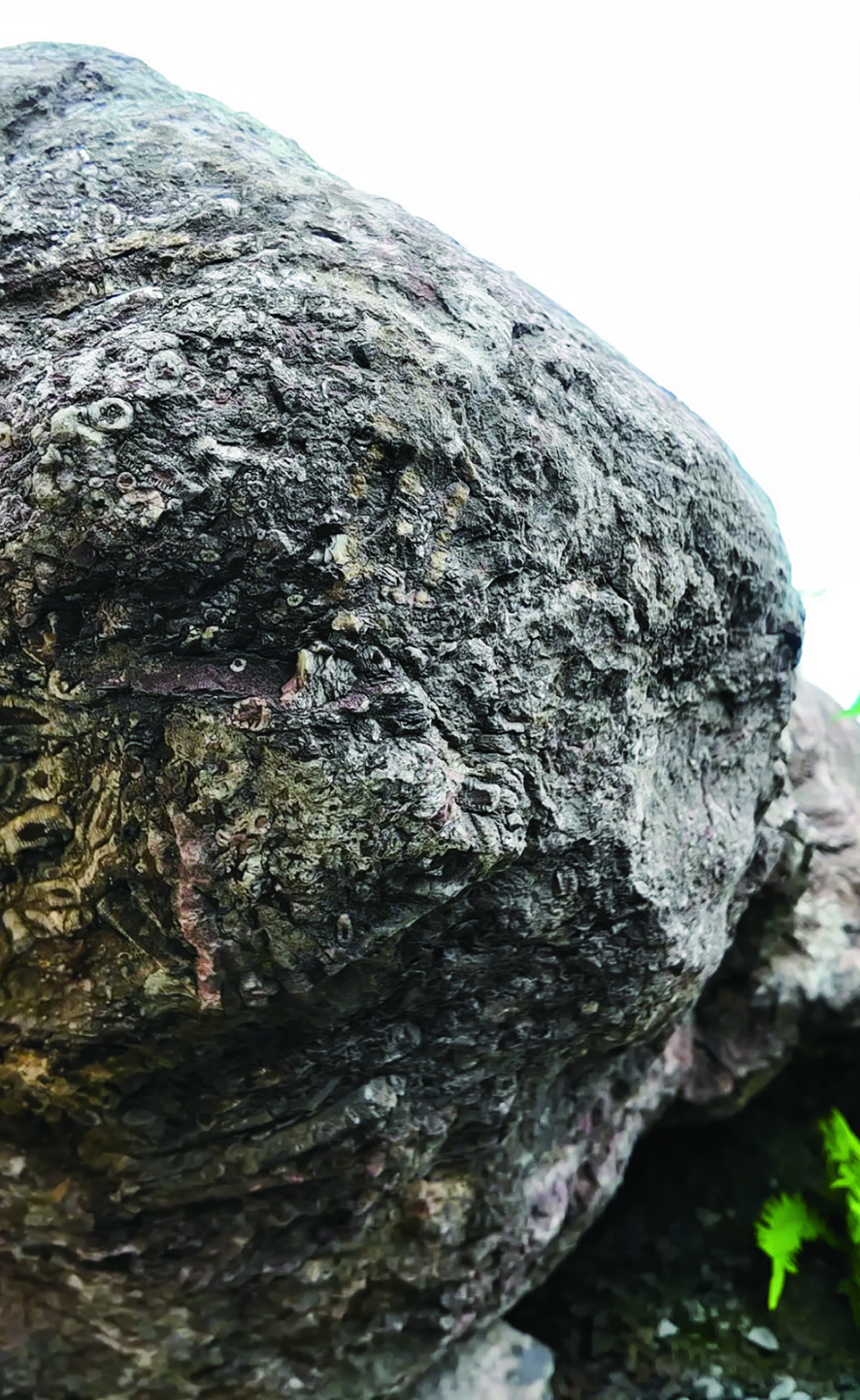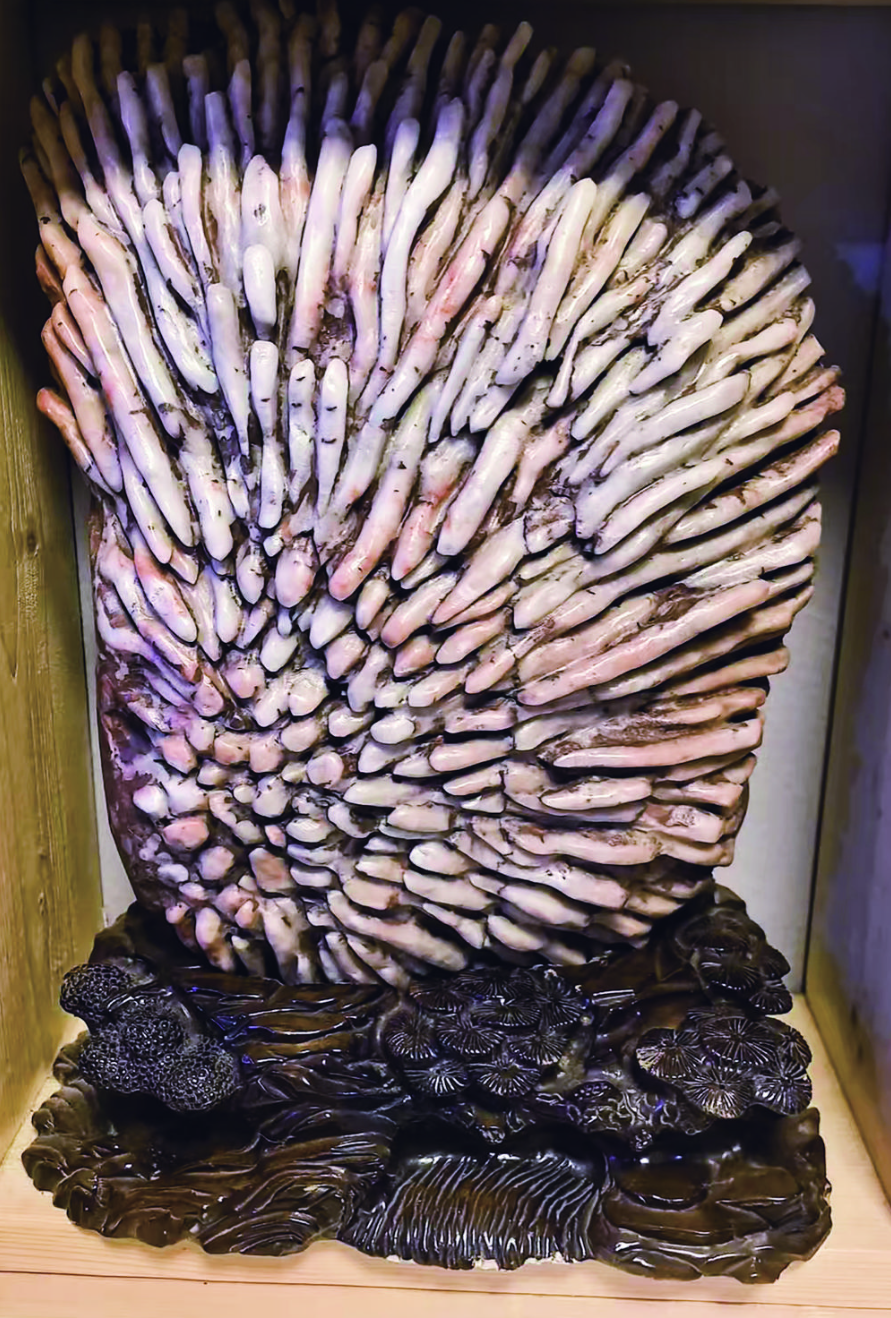 在众多藏品中,两块巨型海百合茎化石尤为引人注目。古生物化石形成条件严苛,需历经数亿年地质沉积、地壳运动等多重变迁才能成型,而海百合茎化石想要完整保存极为不易,体量达到8至10吨且品相完好、色彩丰富、整体性强的标本,在业内罕见。