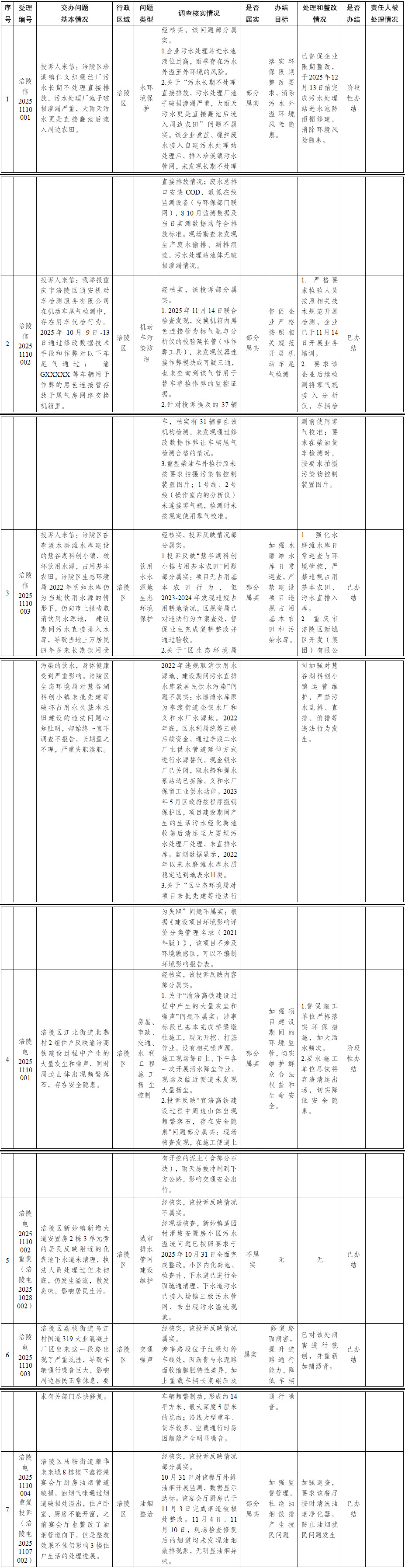 重庆市第二轮第三批第四生态环境保护督察组群众信访举报转办和边督边改公开情况一览表 (第12批2025年11月10日)