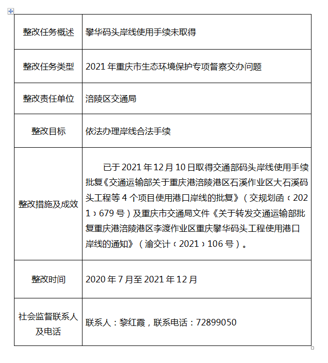 重庆市生态环境保护督察反馈整改销号公示表(攀华码头岸线)