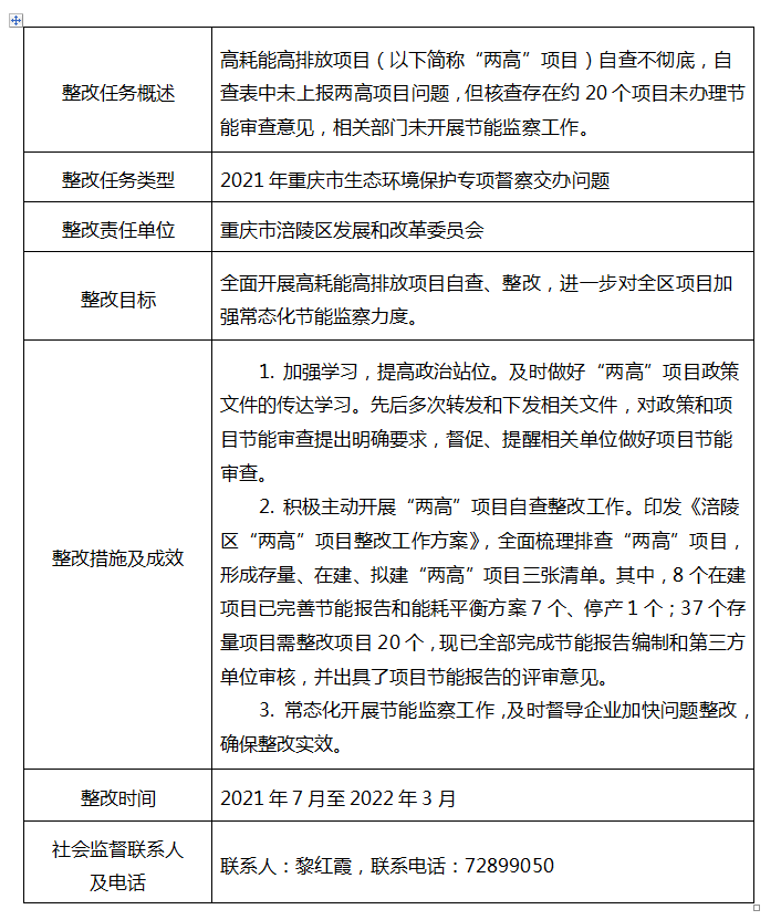 重庆市生态环境保护督察反馈整改销号公示表(高耗能高排放项目)