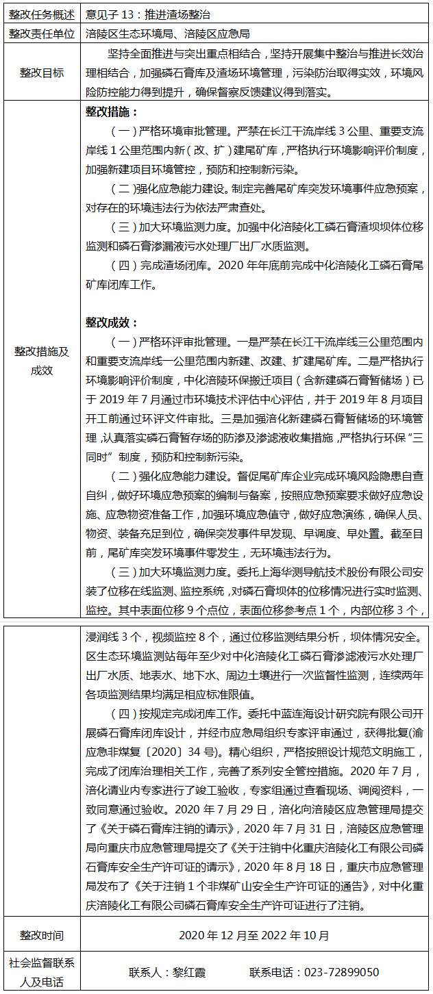 重庆市生态环境保护督察反馈交办问题整改销号情况公示表(推进渣场整治)