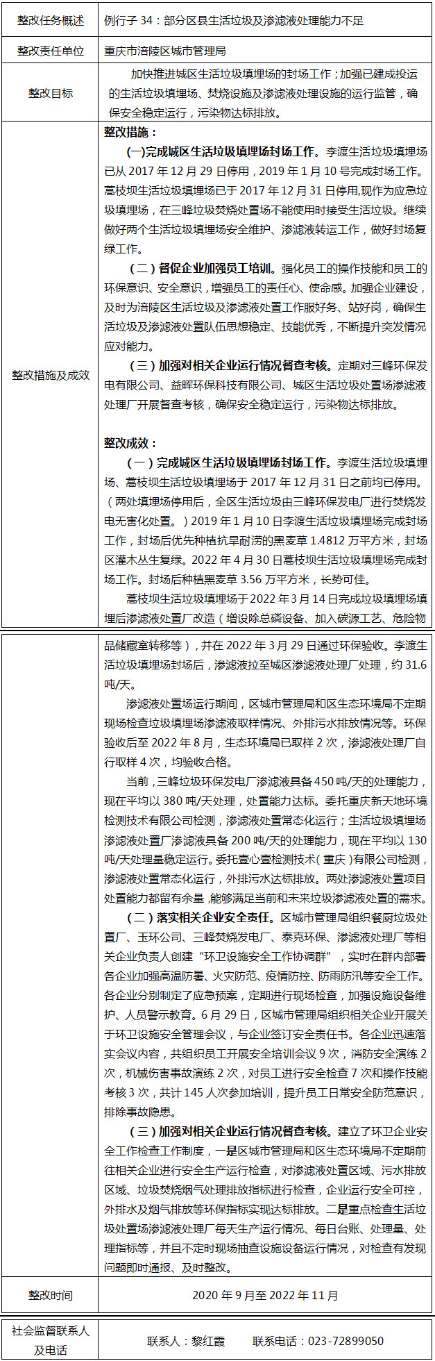 重庆市生态环境保护督察反馈交办问题整改销号情况公示表(生活垃圾及渗滤液处理能力)
