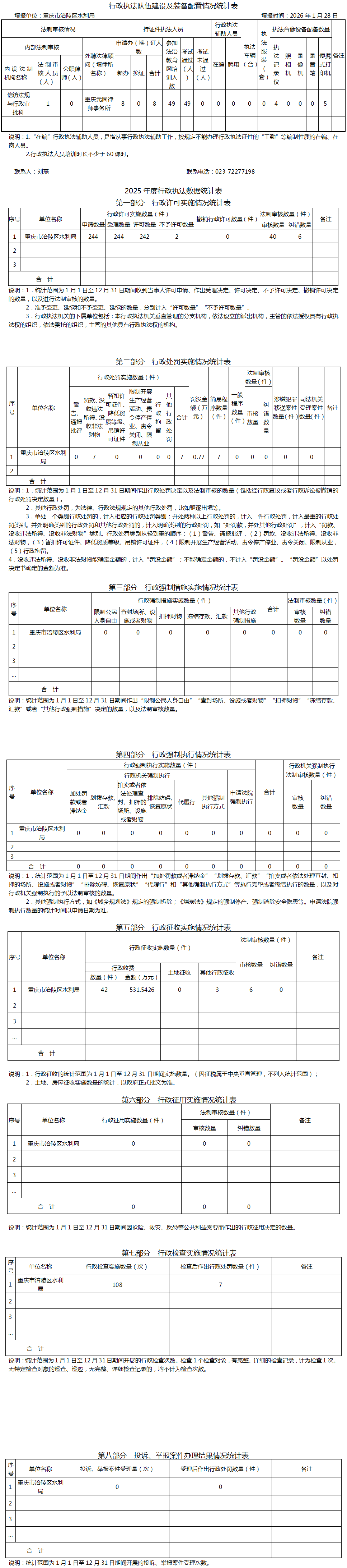 涪陵区水利局2025年度行政执法数据公示
