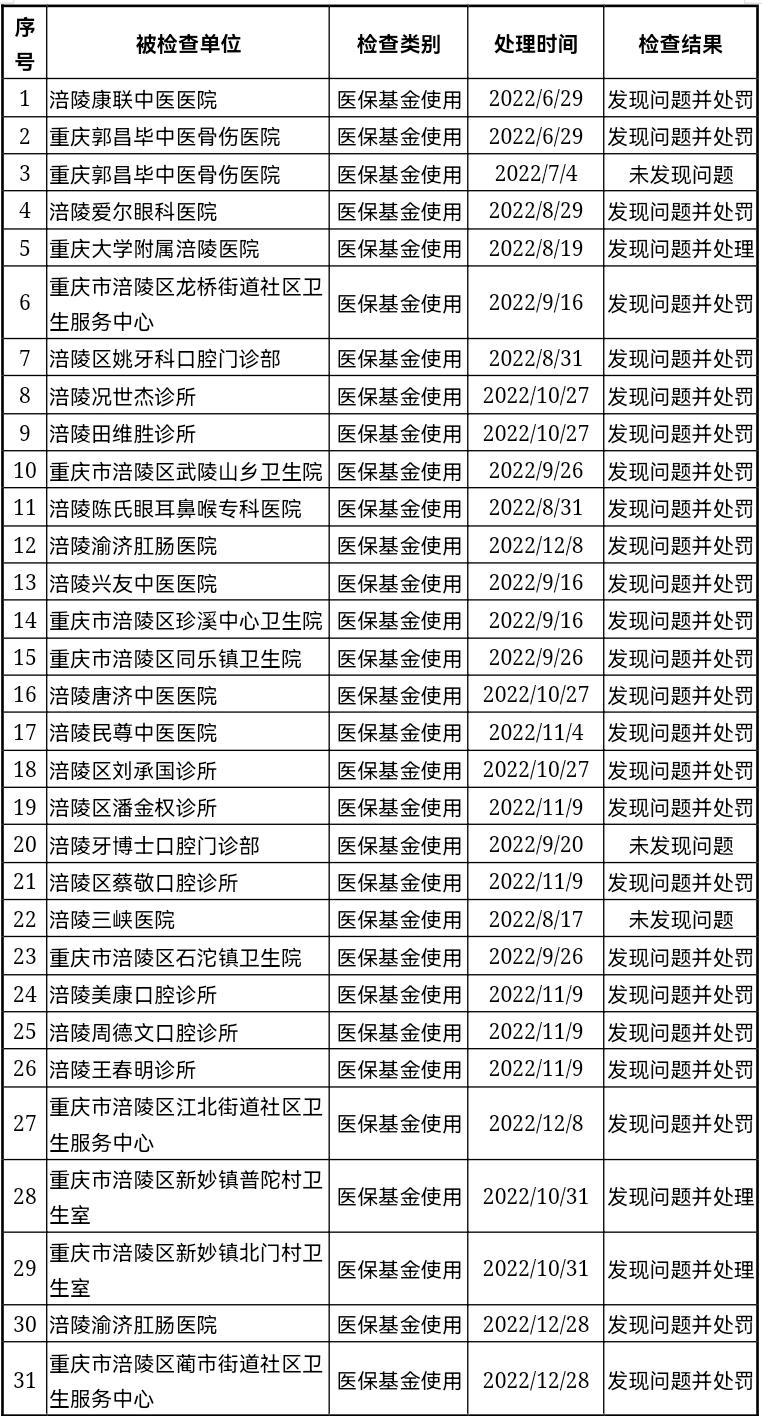 重庆市涪陵区医疗保障局2022年度检查情况