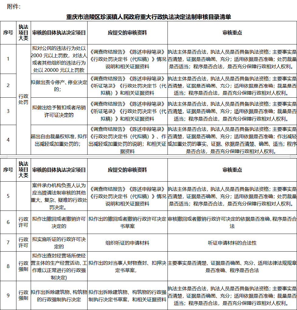 为贯彻落实《重庆市涪陵区重大行政执法决定法制审核办法》,我镇制定并向社会公布《珍溪镇重大行政执法决定法制审核目录清单》,现印发给你们,请遵照执行。