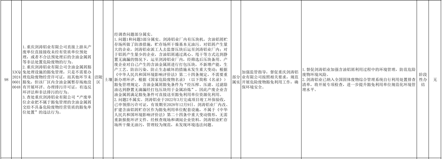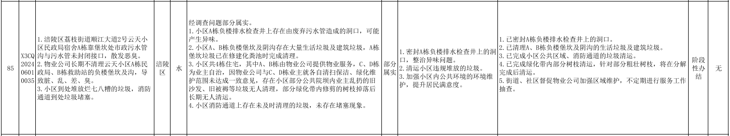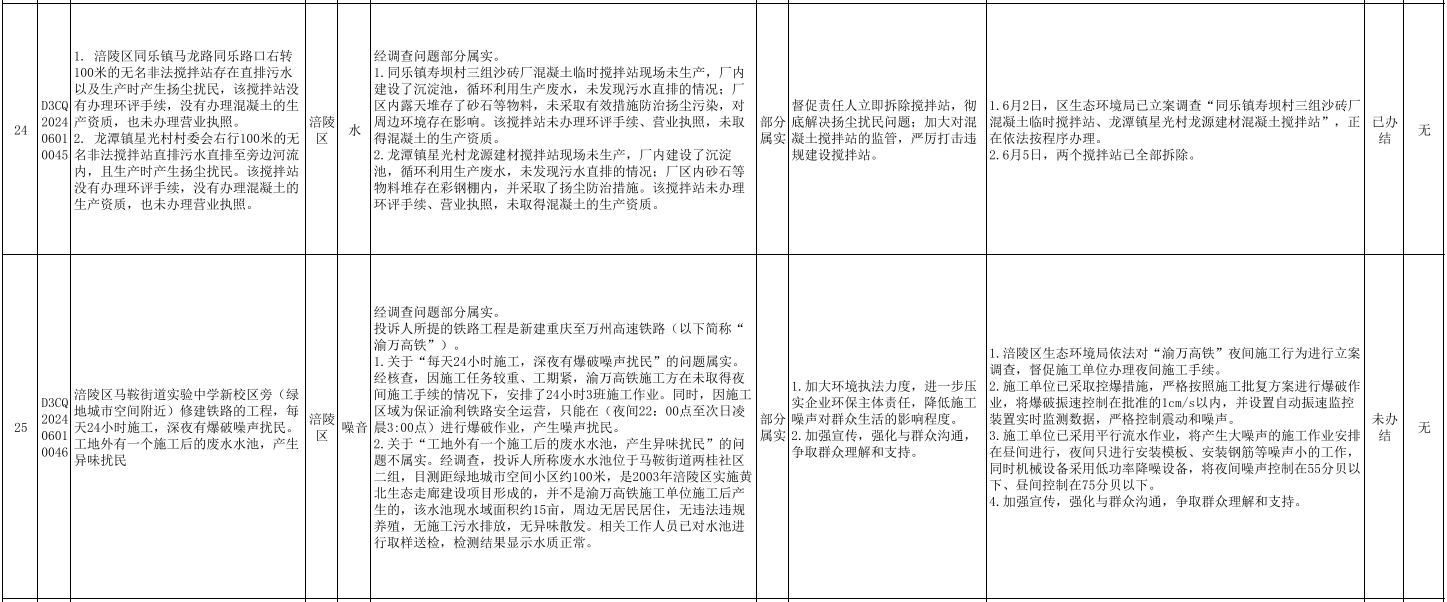 截至2024年6月12日,对中央第六生态环境保护督察组移交涪陵区的第二十五批群众信访举报件,各责任单位均按要求上报调查处理情况。目前,涪陵区4件,已办结3件,正在办理1件。